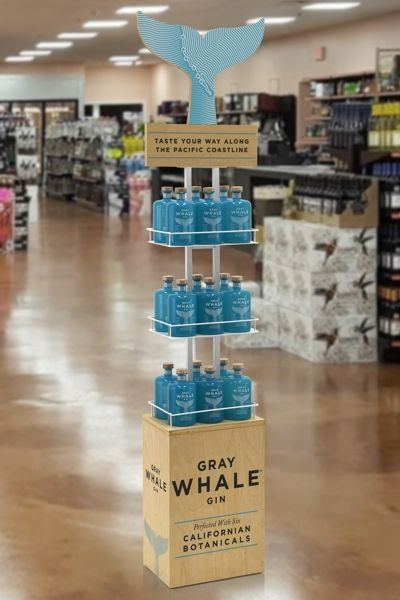 Gray Whale is a relative newcomer to the niche craft gin category. Over the past 5 years the craft spirits category has exploded with craft tequilas, whiskeys, vodkas, gins, etc. Of all the categories, gin has been the most explosive for the flavor profile around gin can be hand crafted to a specific taste and texture. Gray Whale is a California gin that is clean, crisp, and not overbearing in its floral overtones. The target consumer is the millennial and post-millennial that wishes to explore and try new products. This Gray Whale Tail display needed to secure valuable floor space bringing the consumer into a specific ocean feel, and the calming soothing effects of the ocean transformed with their ocean blue bottle. The key sell-in of 3 cases to a retailer allowed a minimal risk on the retailers’ part and a maximum result for this display needed to be easy to shop, replenish, and blend into every store décor.