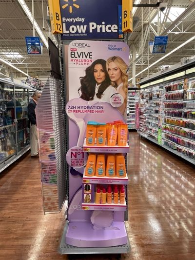 The objective of the L’Orèal Paris Walmart Elvive Hyaluron Endstand was to launch the Elvive shampoo and conditioner variant that included Hyaluronic Care Complex, which was a Walmart-exclusive product. The design is meant to highlight the product and create a confident, uncluttered space to view and shop the product while drawing attention to the endcap, depicting the increased hydration and moisturization the product provides, and driving traffic to the area where shoppers could choose the product.