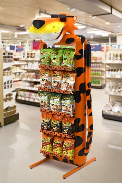 Frito Lay has developed a collection of displays that fit extremely well in the convenience store markets that emphasize certain flavor enhancements of their variety of snack products. The first execution was for flaming hot and they developed an oversized fire extinguisher. The second adoration, they focused on intense flavor, where a jalapeno pepper was the attraction. Nothing is more attractive and attention getting than their iconic Chester Cheetah. We wanted to create an iconic display worthy of selfies on Instagram and other social media outlets showcasing the Cheetos brand. The simple and bold direct look of a 3-D Chester Cheetah was a homerun. This display was made for convenience stores and small grocery stores and was merchandised with single serve Cheetos products. All Frito Lay displays are managed by a DSD, direct store delivery, network. The preceding displays have been extremely successful in this market. The objective was to develop a durable, fun, 3-D Chester holding all of their fun snacks. Special consideration for material selection, durability, functionality, ease of assembly and most importantly ease of shopping were parameters we needed to consider. The target is all fans of Cheetos products and consumers looking for a taste experience, for the Cheetos brand has numerous flavor and line extensions that can be merchandised on this 3-D spectacular display.